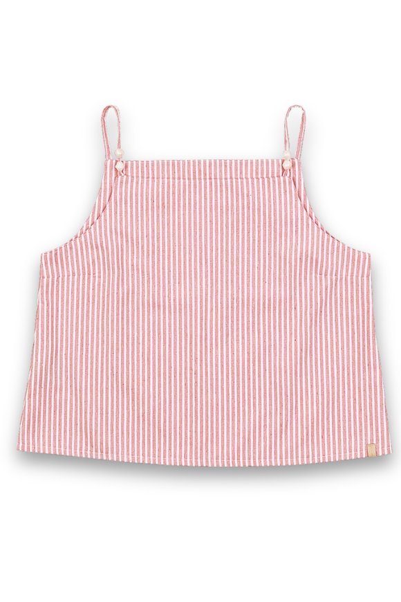Blusa confeccionada em tecido plano eco camomila com fibras diversas, detalhe de miçangas em formato de concha nas alças.