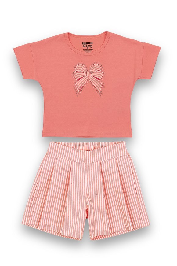Estampa com aplicação de strass. Modelagem confortável, com pregas que imitam saia, mas é shorts.
