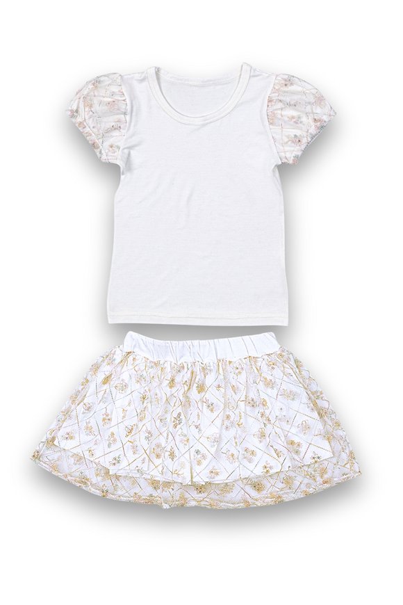 Conjunto infantil feminino ideal para festas e eventos especiais. Parte superior em tule 65% poliéster 35% poliamida com flores bordadas e lantejoulas delicadas que dão brilho sutil.