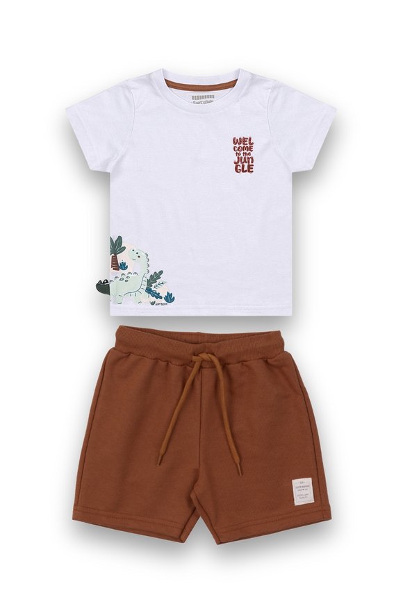 Conjunto infantil masculino composto por camiseta em meia malha 100% algodão e bermuda em moletinho 50% algodão 50% poliéster, com cós em punho.