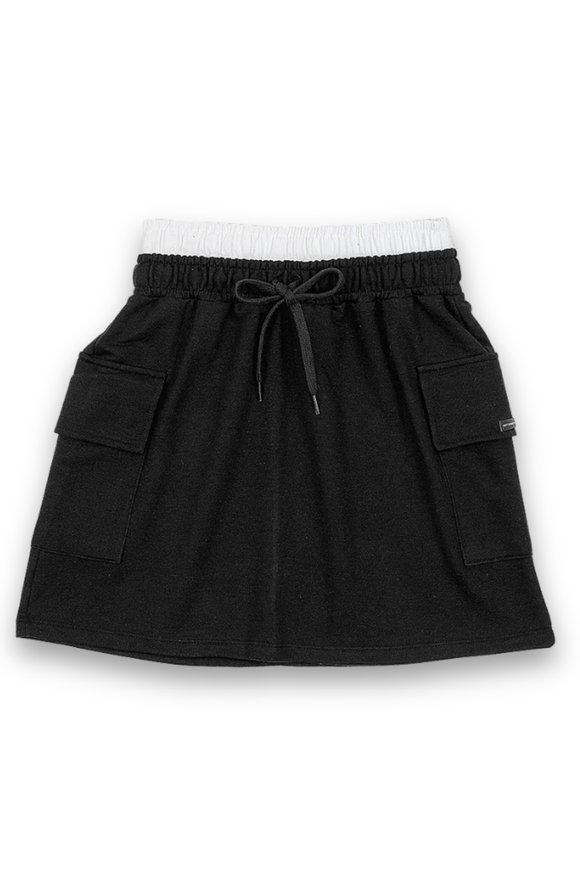 Saia em moletinho 50% algodão 50% poliéster com detalhe em tactel com elastano 94% poliéster 6% elastano.