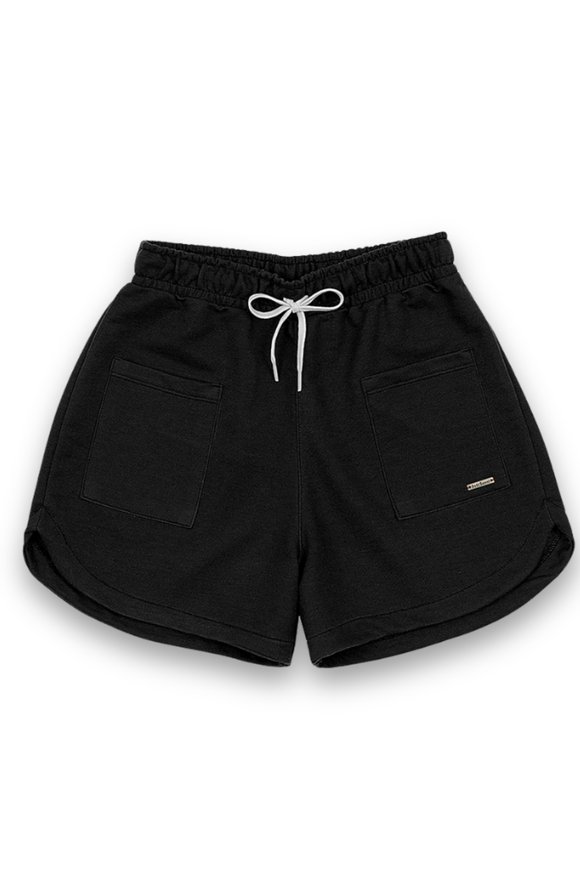 Shorts em moletinho 50% algodão 50% poliéster com cordão funcional contrastante e plaquinha prata da marca.